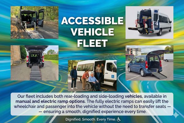 Our fleet includes both rear-loading and side-loading vehicles, available in manual and electric ramp options. The fully electric ramps can easily lift the wheelchair and passenger into the vehicle without the need to transfer seats — ensuring a smooth, dignified experience every time.
